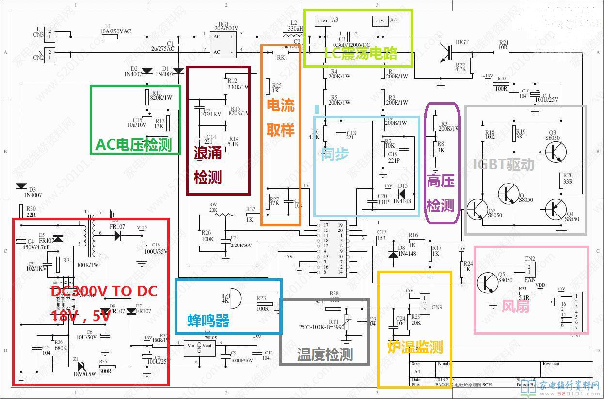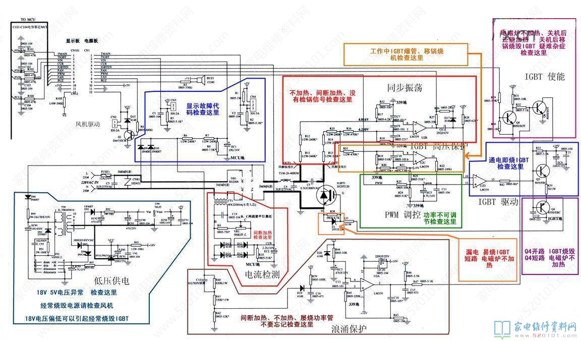 最近有网友说刚开始接触电磁炉维修,想学习下看电路图,可是怎么都看不懂工作原理,不知道哪里是检锅信号线路、驱动线路、同步线路,取样线路、温度检测线路、高压保护线路等,能不能找一张典型的电磁炉电路图,然后标明详细的线路,今天我就给大家分享两张典型的电路图,供新手学习参考用。
