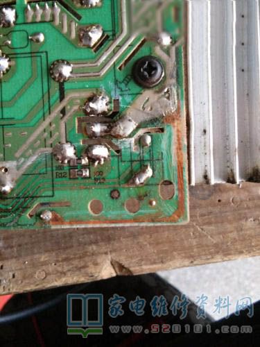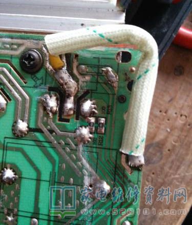 最近接修一台康佳电磁炉,故障现象为通电开机大约三秒就自动跳到开关灯一直闪烁,重启依旧,无检锅声,按照平常思路一般无检锅声虽然不检锅但不会自动跳到开关灯闪烁,由于基础没打好,期间查书籍看到浪涌电路有故障会导致不加热功效管不导通,然后就逐个查,没查出个结果,后面才注意到下图中地方绝缘漆全起泡了,全部刮开铜片里面的铜像铁锈一样一刮就掉了碎了,拿万用表一量不通断路了,找条线接上试机正常,故障修复。