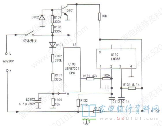 市电检测:D101对市电整流后经R102~R104分压,EC102滤波,得到一直流电压,送往CPU⑧脚,CPU据此对市电电压进行监测,当过高或过低时,都会发出报警指令。过流保护:U110(LM358 )是一个双运放电路(本机只用其中一个运放),其③脚(同相输入端)通过R134接+5V,作为基准电压,②脚(反相输入端)通过R132接电流检测电阻R135的左端,R135的右端接+5V,由此可见U110的作用是检测R135两端电压。