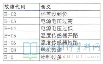 上述设计的目的是防止在工作过程中,由于负载增加引起检测电压下降而误报警。另外,由于EC102容量较大,也能避免瞬时电压跌落引起的误报警。为便于以后维修该型机,实测本机温度传感器的阻值为47k (室温为25°C),其两端电压为3.96V。并附上本机部分故障代码,见表1,供参考。