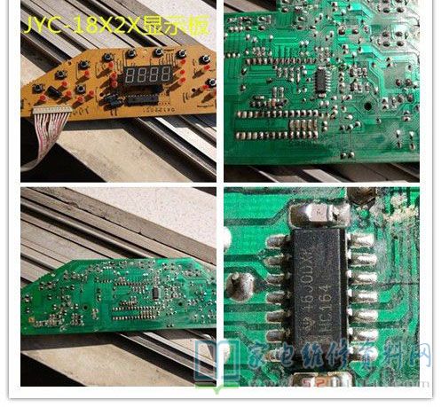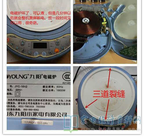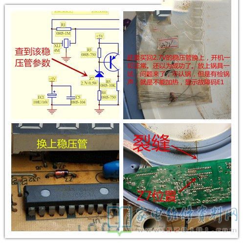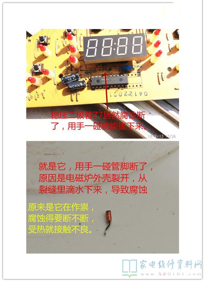 接修一台九阳JYC-18X2电磁炉,客户说用了十年有余,这几年机壳老化开裂了,一直没去管它,继续使用,但早几天突然使用中断电,过段时间插上去又能用,还以为是电源插座接触不良,后来这个现象频繁发生,肯定是坏了。检查发现,是由于裂缝中渗水进来,腐蚀了电路板上的元件,稳压管Z7的脚快腐蚀断了,但还有接触,受热后就接触不良。导致能用,但不能持续用。