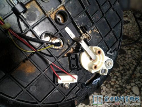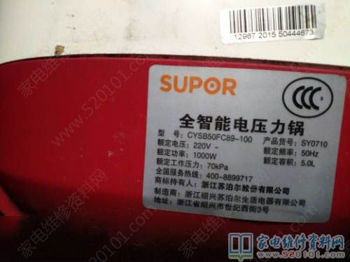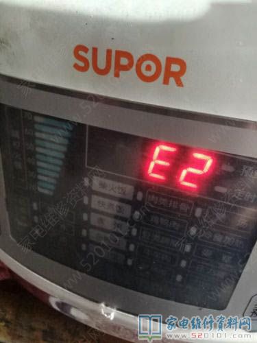 接修一台苏泊尔CYSB50FC89-100电压力锅,故障表现为通电显示正常,按功能键马上显示E2不加热,此故障为上盖传感器断线导致的,如下图所示,只要拆开上盖将线接上(最好套上热水管)就可以修复。此电压力锅的上盖拆卸比较麻烦,需要费一点功夫才行。