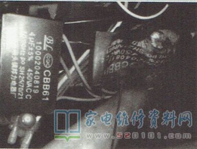 接修一台全家乐CXW-210-A01吸油烟机,左风扇工作正常,右风扇不转。根据故障现象分析,判断故障原因应是右风扇电机或电机启动电容异常。拆机检查,目测电控板上一只电机启动电容已损坏,如图1所示。将其换新后试机,故障排除。