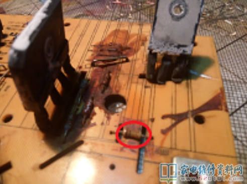 最近接修一台苏泊尔C21-SDHC08电磁炉,故障表现为提示E0代码,拆机检查发现整流块下面的一个100K的电阻开路,故障点如下图所示,造成此故障提示E0,更换此电阻后故障排除,试机一切正常。