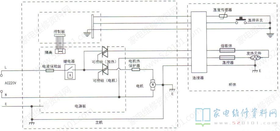 本机故障有两个特点: 一是水沸腾后仍然加热,不进入下一个程序;二是选择不加热的功能时却错误地加热。前面在传感器,上并联电阻,可以使机器进入下一个程序,但加热控制还是不正常。综合上述情况分析,电脑板内部数据出错,且无法修正。因买不到该机电脑板,只得让客户送特约维修点,后客户反馈说确实是换了电脑板才修好的。事后遇到一台同型号正常机器,实测结果如下:在“豆浆”功能的加热阶段,先是全功率( 800w) 持续加热,水沸腾后加热功率依次降 为570W、500W、420W .370W,并且各阶段都处于间歇加热状态,目的是维持水温,当屏显“倒计时11分钟”时,电机开始低速旋转,50s后转为高速旋转。在电机旋转时,加热停止。随后电机旋转和加热处于交替状态,且加热处于小功率间歇工作状态。因本机没有设置豆浆防溢检测棒,所以采用小功率间歇加热,可防止豆浆溢出。