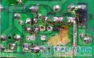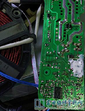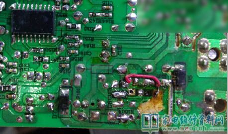 最近接修一台苏泊尔c21-SDHCB15电磁炉,客户反应说不慎进水烧坏。开盖后发现电源芯片炸飞,查资料芯片型号为OB2226SP,翻看电路板背面电源部分R159,R160及部分铜箔已烧毁面目全非,用酒精清理电路板积碳后检测电源部分除了OB2226SP和芯片供电电阻R147及芯片4脚与8脚之间R159 R160两个贴片电阻烧坏外其他一切都完好,由于手头无此芯片,受网友启发决定用VIPER12A改此电路,具体步奏:拆除原电路中贴片启动电阻R157 R158及4脚与8脚之间电阻R159 R160和芯片2脚与8脚之间的贴片电容C123。