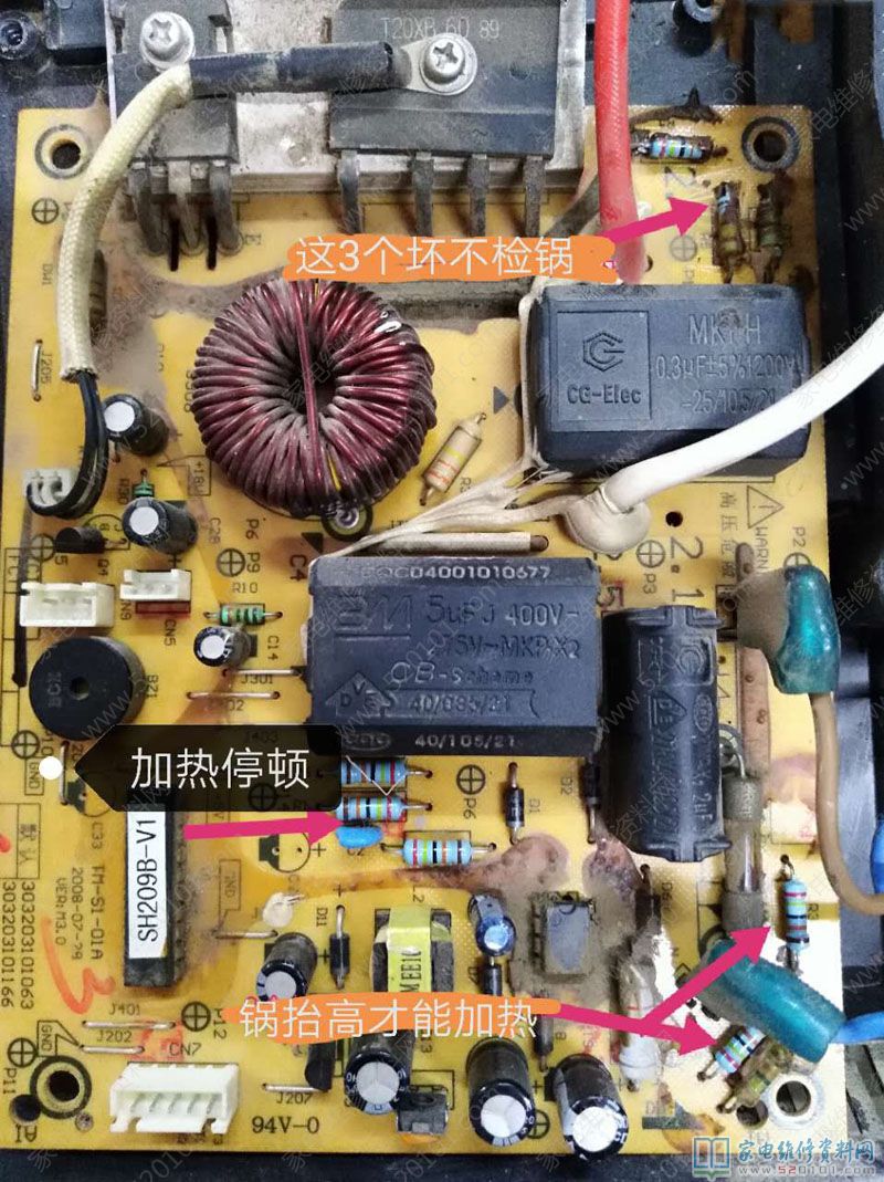 美的MC系列电磁炉常见加热停顿、锅抬高才能加热、不检锅的三个故障,请按照下图示中的标注故障点进行维修,供广大网友维修参考用。
