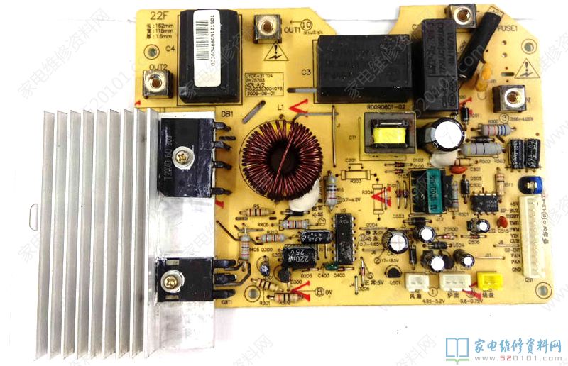 接修一台九阳JYC-21ES55C电磁炉,故障表现为不通电,拆机检测保险管断路,功率管短路,跟换之,外接假负载,开机,瞬间报E0故障代码,网上查故障代码为内线路故障,拆机查大电阻,三极管无短路,断路,查二极管,IGBT旁标的C18稳压二极管短路,因手上没有一样的,代换in4148稳压二极管22v,原机18v试机,开机正常。
