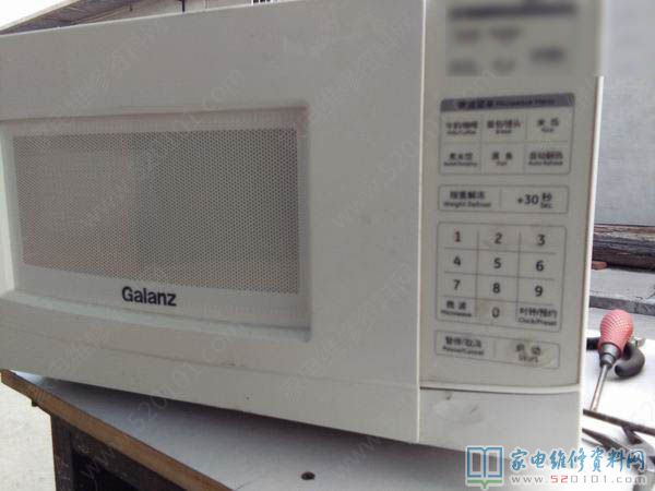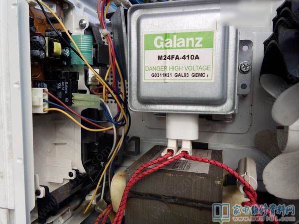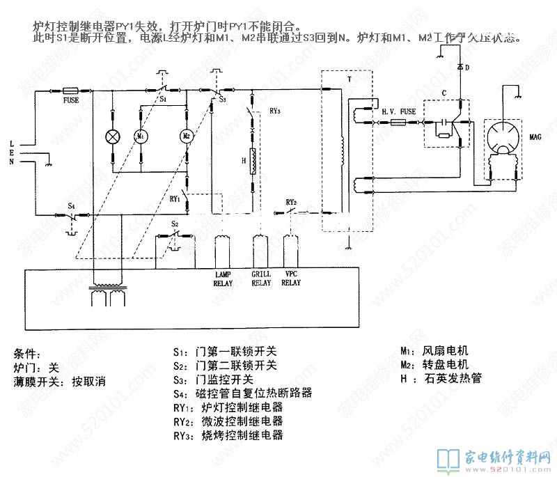 接修一台格兰仕P70D20AP-TF(W0)型微波炉能正常加热,故障表现为开门后灯还亮,转盘继续转,初步检查门开关动作正常,拆开并清洁控制转盘电机,检查微动开关触点正常。最后检查出是控制板上的灯控继电器线圈开路,打开炉门时常开触点不能闭合。导致炉灯与风扇和转盘电机串联在220V回路中,欠压运行,如下图所示。