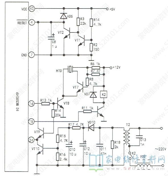 分析检修:CPU控制电路工作条件有四:一是5V(允许误差5±0.5V)电源正常:二是④脚输入的复位脉冲信号正确;三是②、③脚外接时钟振荡器工作正常;四是CPU芯片本身完好。检修时,先测CPU 40脚(vcC)电压为5V正常,再测④脚电压为0.3V,说明CPU处于复位状态(此时②、③脚时钟电路停振)。测24脚电压为4.9V 高电平,表示过流保护电路未动作,欠压保护电路工作失常。根据欠压保护电路工作原理,当R14、VT1开路损坏或VT2、C8击穿漏电时,均会引起④脚电压变低而使CPU复位。经检查,C8( 1uF/16V)漏电,更换后试机,故障排除。