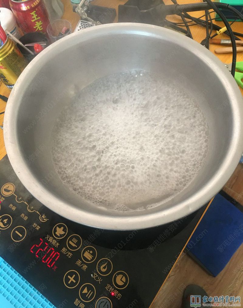 接修一台九阳C22-L2电磁炉,用户说烧水很慢,插电测试开最大功率烧水,几分钟过去锅底只有几个气泡;拆开一看,脏乱差全是蟑螂实体和蟑螂屎。弄得手实在太脏不想拿手机就没拍照。只能洗板子了,顺便拆下三个大电容,容量都正常,板子上的原件没有明显烧坏的痕迹。