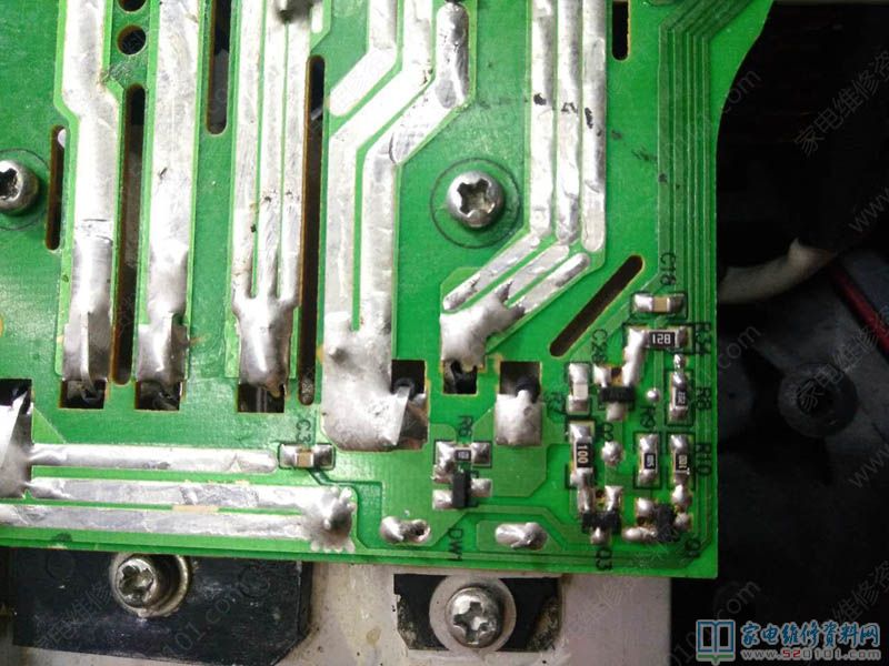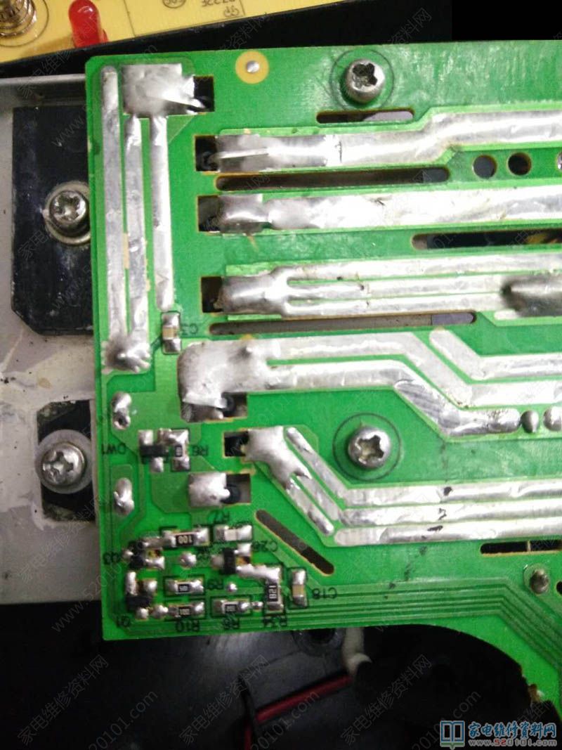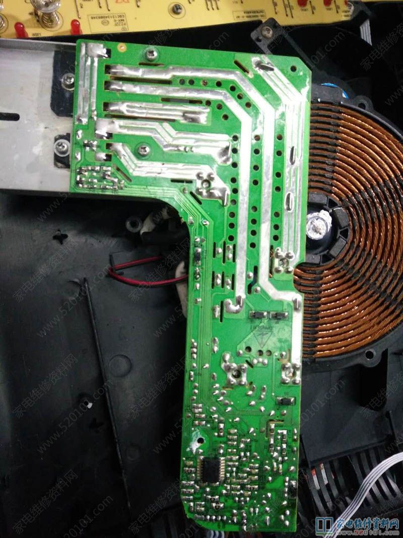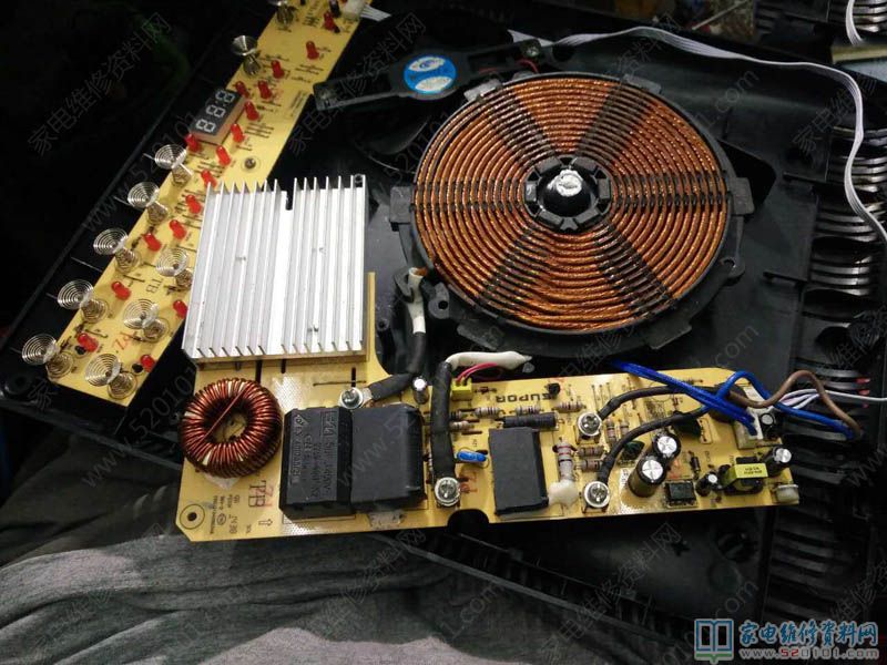 接修一台苏泊尔电磁炉,型号是C21-SDHCB33K,故障表现为不通电,拆开外壳,发现主板,显示板好多蟑螂屎,肯定板子漏电,给用户报价紫黑,用户同意后开始维修。于是拆了,水洗主板、显示板、底壳(我一般就用白猫,立白洗衣粉水洗),清洗完毕后马上用吹风把全部吹干,开始维修主板,用户拿来不通电,肯定保险坏了,功率管100%坏了,检查,果然已经洗白,而且桥堆也击穿损坏了,将坏了的换后,通电试机,发现开机后放锅,不报警,不加热,而且显示E0。