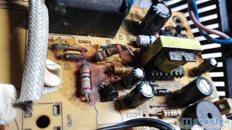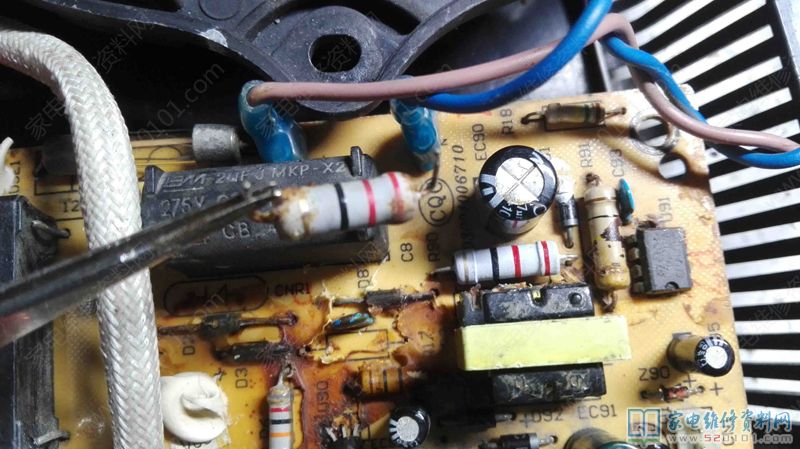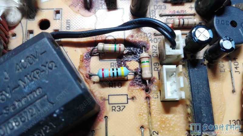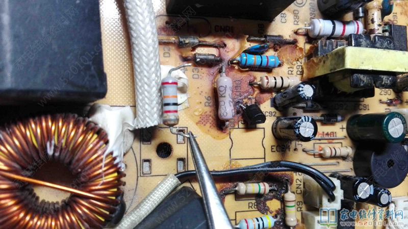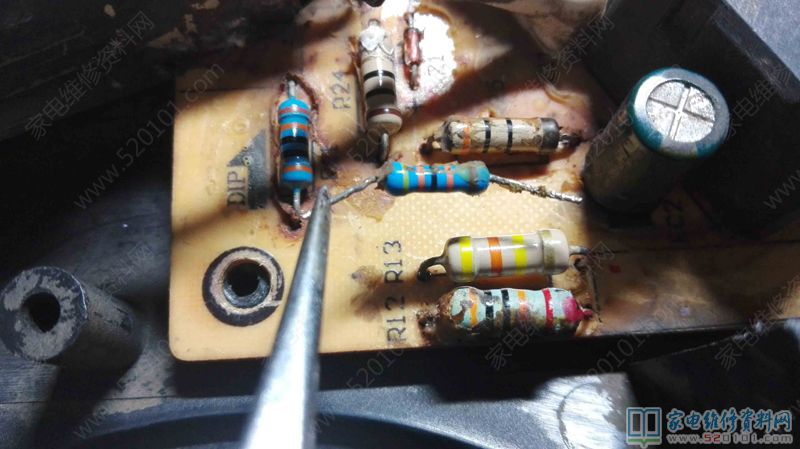 最大可能就是几个大电阻了,于是开始检查大电阻,一查,靠中间的一组同步电路400K、150K电阻阻值明显变大,于是更换掉。400K电阻在电磁炉里确实不太常见,390K和470K的较多。