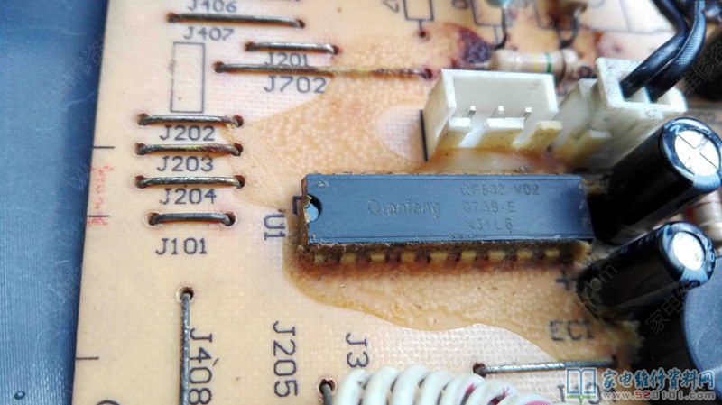 真是奇怪!普通的色环电阻变成热敏电阻了!看到这个阻值变化,电磁炉断续加热也就好解释了。开始这个处于电压检测电路的820K电阻阻值正常,CPU得到的取样电压正常,所以正常加热,但是停一会儿电阻温度升高,阻值降低,导致取样电压升高,CPU判断电压偏高进行过压保护,于是停止加热,又停一小会儿后,电阻温度被风扇降低,阻值升为正常,所以电磁炉又能正常加热,如此循环往复导致电磁炉断续加热。这个CPU是QF808,其第一脚和820电阻相连,而这个脚就是市电过压过流保护信号输入脚。