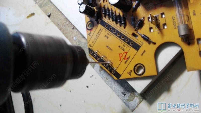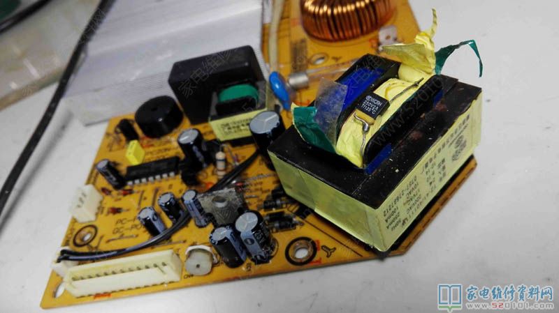 手头找不到这样的变压器,也没有电源模块。从一电磁炉主板上找到一个双输出的变压器,上面没有标签,测量应该是双24V的。原来的变压器次级有4根线,这个变压器次级只有三根线。打算用这个变压器改造一下,但是外形小了一些,次级几个脚能放进原来的孔里,初级放不进去,于是用电钻重新钻孔。