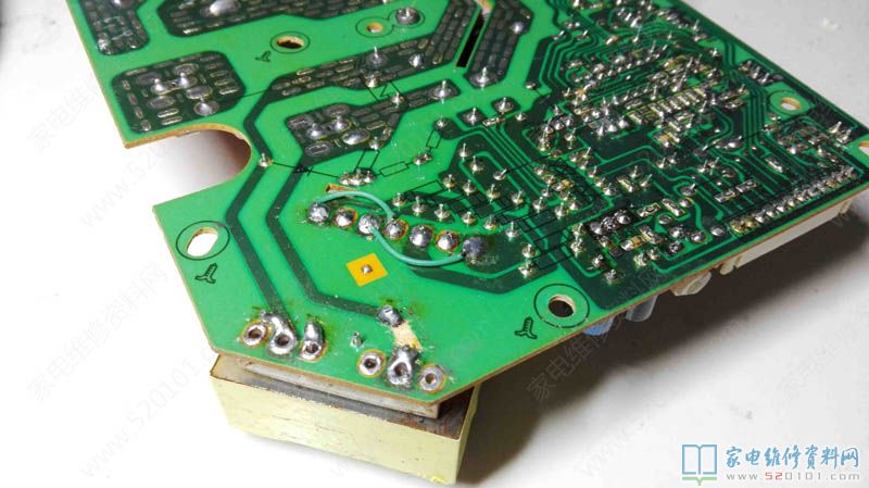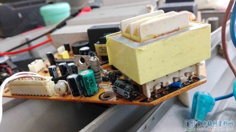 断电再把电路改一下,不然7805可能受不了。在整流二极管输出正极这边串了个100多欧的大电阻来降压限流,测试降到20多伏,就这样吧。还有整流后的滤波电容原来是25V的,肯定不行,刚才通电一小会儿,已经开始漏液了,再等一会就要爆破了。于是换成了35V的,18V那一路的滤波电容原来是35V的,我给换成了50V的。那一路的电压比原来高一些应该问题不大,只要电流差不多就行了。