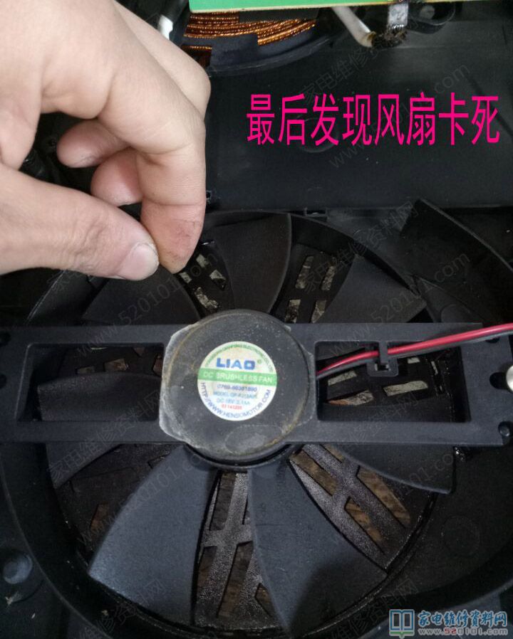 接修一台美的C21-FK2101电磁炉,故障表现为通电试机出现E6代码,拆机检测RT3的管温和炉面温度加热后正常150K下降到5K,以为是它的故障,但是更换后故障依旧,最后发现是风扇卡死导致的。