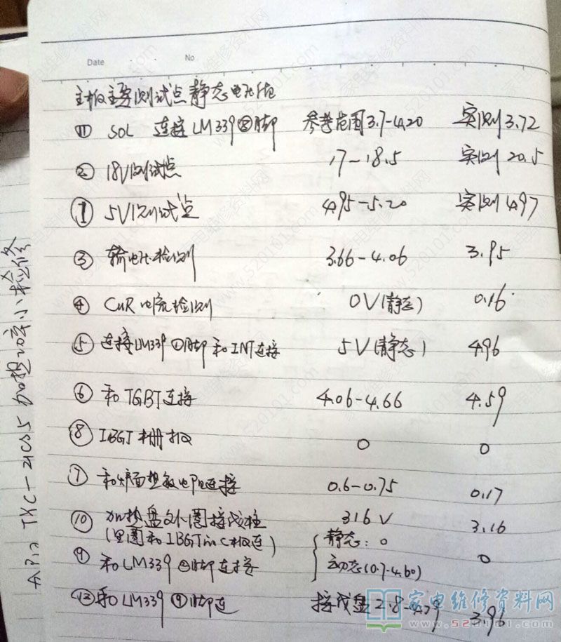 检查其它功能,都一样加热慢。用尽了所有的经验全部无效。CUR可调电阻正常,大电阻正常,三大电压正常。先后更换IBGT,5微法、0.33微法电容,LM339,8050,8550,毫无结果。主板上有12个测试点,除了第七个测试电压为0.17伏,参考0.6-0.75,它和路面热敏电阻有关,检查相关部分,未见异常,更换一个100K的热敏电阻,故障依旧。其它都在范围内。见下图2。
