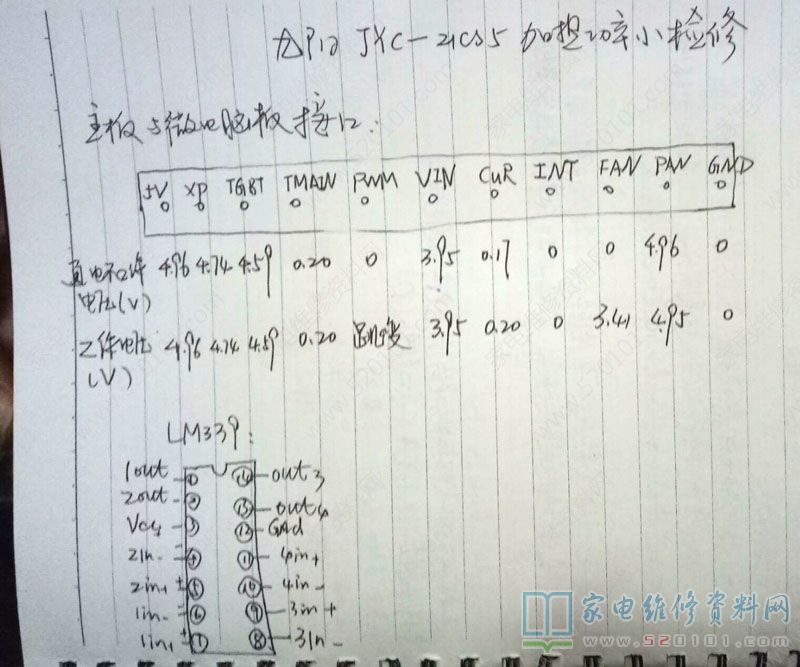 试图从主板与电脑板之间的连接口找到突破口,除了知道VIN、CUR、PWM、TGBT、FAN的功能,其它如XP、INT、PAN根本就没研究过。检测结果见图片:结果分析,电磁炉工作时,PWM跳变,通过积分电路到LM339的11脚的电压也是跳变,正常的应该是恒定电压2-4V,电磁炉加热慢的原因看似就在这里。难道是电脑板坏了?如果有配件的话,可能就更换了。前面讲了接口处有几个脚位功能不熟悉,信号流向不清楚。看来不下大力气,不从图纸上分析,维修的结果只有失败。