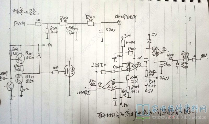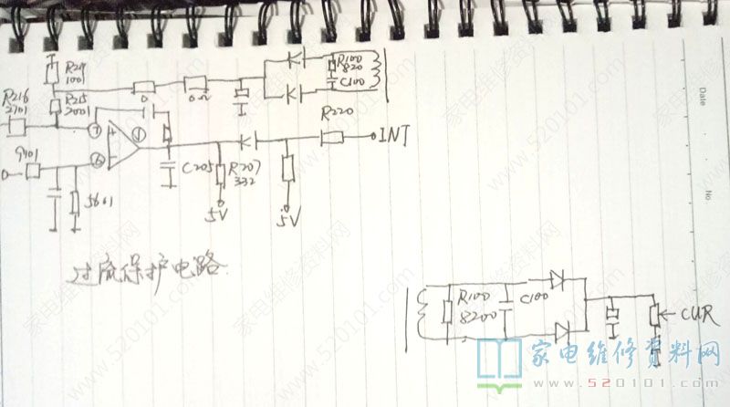 搞不到图纸,用昏花之眼,费了很长的时间绘制了电路图,一边绘制一边分析,图成了问题也解决了。原来是芝麻小电阻开路了,一定要记住它的图号R100,精密阻值8200。换了个1K的普通电阻上去,电磁炉终于可以工作了。不过功率不是很足,调可调电阻(10K),电流最大6.4安培,最小5安培,看来是电阻不合适。通过计算,又并上一个4.7K的普通电阻,把可调置于中间位置就可以电流调到9安培。至此维修结束。