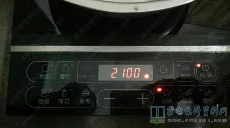 接修一台九阳JYC-21CS5电磁炉,故障表现为功率不足,接一盆水试烧,火锅功能显示2100W,加热半小时,水只有微温,如下图1所示。