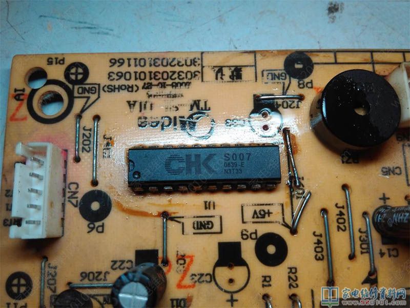接修一台美的C21-SH2131电磁炉,是同行送过来的转修机,用户说,电磁炉启不动,前维修师傅换功率管后,用了几分钟,电磁炉内放了个鞭炮的声音之后什么都没有了,前维修师傅说不能修了,听人介绍找到本店。拆机一检测,保险,功率场效应管,整流桥,都挂掉,大电阻,大电容等都动过焊,应该是都检查过了,将损坏的元件换新,串上灯泡试机,没有上电蜂鸣声,测5V只有2.4V,18V正常,断开芯片(S007)5V跳线(如下图2所示)。
