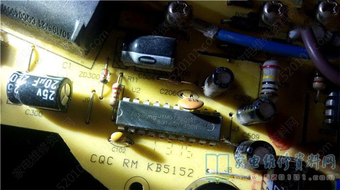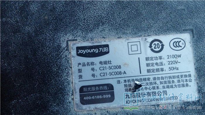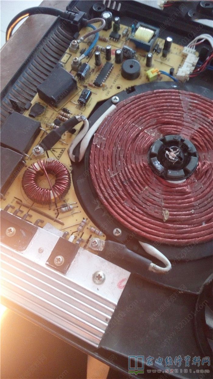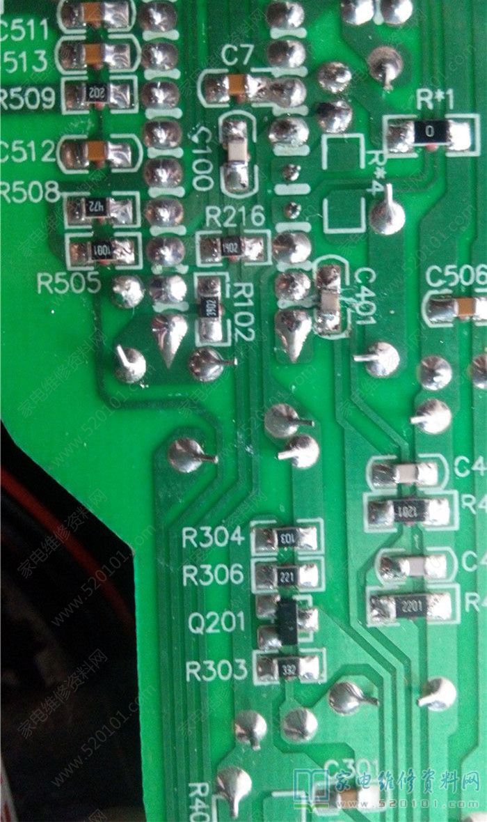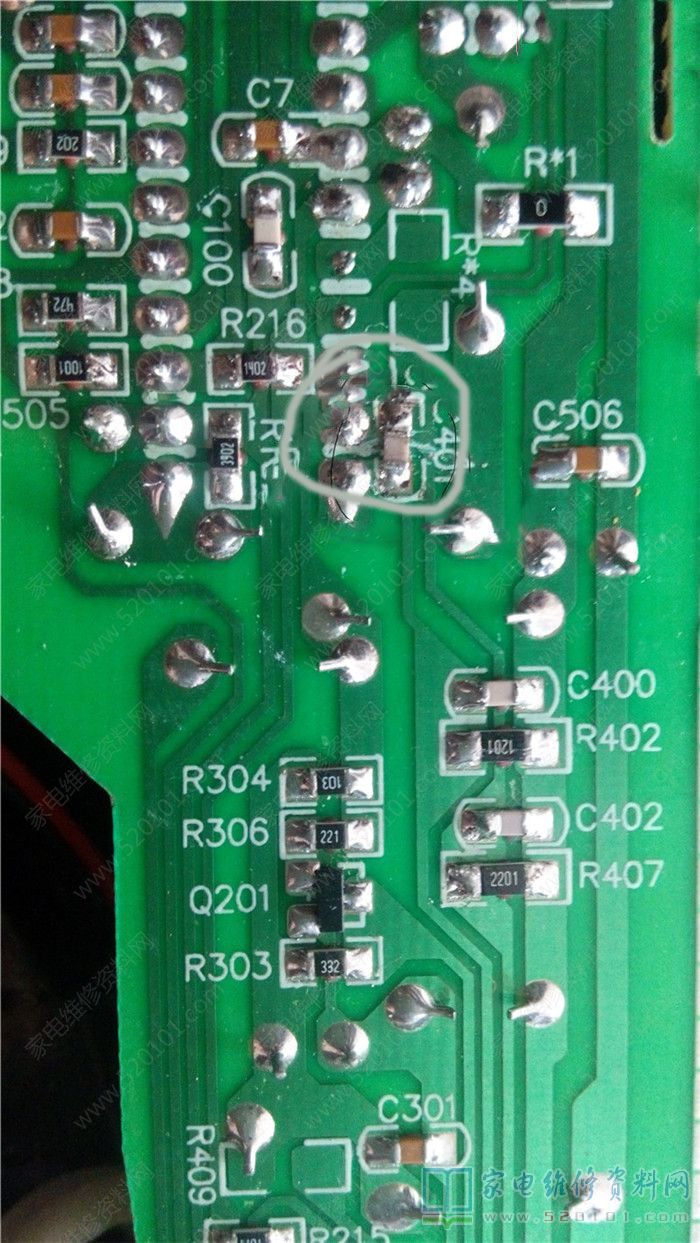 接修一台九阳C21-SC008电磁炉,客户反映断续加热,试机故障和用户描述一致,打开检查没有功率可调电阻,在检查大电阻阻值正常,大电容阻值正常,没有发现其他明显问题,合盖再次试机发现把锅抬高点可以持续加热,于是开盖检查同步电路,大电阻没有阻值变大也没有热稳定性不良的,又延同步电路继续向下查,R402的1.2K电阻和R407的2.2K电阻也没有问题,下一步就到九阳专用芯片(JYM01020ED)了,看到两角之间有一个贴片电容C401,怀疑是不是漏电,拆下测量容量0.301nF,先不管直接找一个代换,随便找一个换上(221的最后实测303是个漏电的),试机不检锅,更怀疑是电容问题,于是拆下换上的电容再试机,可以正常加热,于是查电路该电容容量为301,原电容没有问题,于是把原来的粘胶清理干净,焊上原电容,试机一切正常,交付给用户使用。