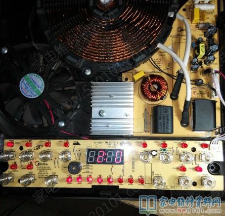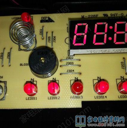 接修一台美的C21-RT2155触摸式电磁炉,故障表现为开机后无论按什么按键都没有反应,拆开电磁炉进行检测,发现是LED(发光二极管)击穿造成的,更换LED后故障修复。大家注意了,此类发光二极管必须拆下来才能检测准确。