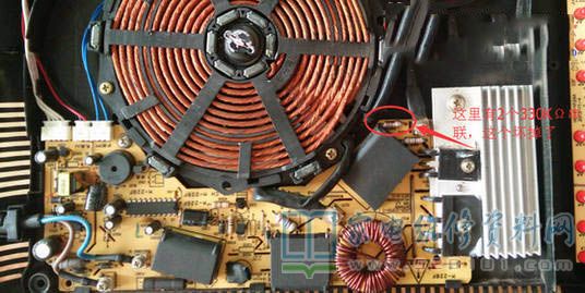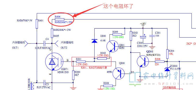 九阳电磁炉坏了,型号是JYC-21HEC05,故障现象是上电启动后,显示E0,且蜂鸣器鸣叫,查了E0代码含义是电路故障,拆机后检查电源端有个1/2W的330KΩ的电阻坏掉了,变为M欧级了,其它地方未发现问题,电源电压5V、18V均正常,更换这个电阻后问题消除了,如下是九阳JYC-21FS37电磁炉主控板原理图(网上没找到完全一致的图,但主控及大部分电路是一样的,可以参考)及不良电阻位置。