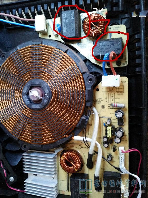 日常碰到电磁炉烧功率管装上后,再测试其它零件无短路的情况下都会习惯接上灯泡试机,通电灯泡不亮就可以安心装上保险丝放上锅试机,如果没有放上锅灯泡很亮,证明电磁炉还有故障或者短路现象,需要继续检查。而今天这台美的电磁炉就比较特别:220V输入后并联2个5uF电容。当时功率管击穿烧保险丝,更换后检查过其它无零件短路接上灯泡试机,灯泡很亮,不敢冒然装上保险丝,再次仔细检查各部分零件都没有短路后先断开功率管通电灯泡还是很亮,断开桥堆还是一样,完全断开220V到整流部分依然如此,这下就确认就是前面这2个5uF电容“兴风作浪”,将这2个电容拿下来就风平浪静了,知道原因后再装上换上保险丝直接试机一切正常。
