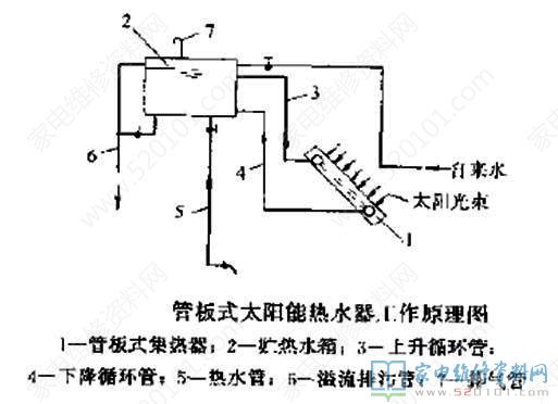 太阳辐射透过玻璃盖板,被集热板吸收后沿肋片和管壁传递到吸热管内的水。吸热管内的水吸热后温度升高,比重减小而上升,形成一个向上的动力,构成一个热虹吸系统。随着热水的不断上移并储存在储水箱上部,同时通过下循环管不断补充温度较低的水,如此循环往复,最终整箱水都升高至一定的温度 。 现有的平板式集热器,基本上都采用结合良好的多管组合方式,如滚压或压延方法等,其中走水管子与吸热板之间的热阻几乎可以忽略。影响平板式集热器板芯性能的主要因素,一是结构设计,二是表面吸收涂层。设计良好的集热器的板芯肋片效率应该在93%以上。集热器的板芯肋片效率与板芯结构、表面处理以及集热器整体结构有关。集热器整体结构的影响可以用总传热系数来描述,其影响程度与自身的几何尺寸(肋片厚度、材质)是一样。也就是说,在同等效率的情况下,集热器热损小时板芯可以薄一些。选择性吸收表面可以提高集热效率,但是市面上这类产品为了提高经济效益,往往肋片较薄。用于热水器场合时,这类产品的实际集热效果与选择性差一些(甚至没有选择性)但肋片厚一些的集热器不会有太大的区别。