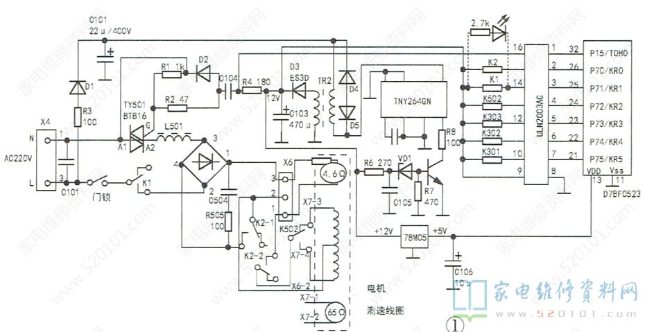 分析检修:查看维修手册,“Err7"为电机停转报警,主要原因有以下两点:(1)电机过热保护,连续4min电机测速器未输出速度反馈信号;(2)电机堵转。测量电机各绕组阻值,均正常,测速绕组的阻值约为652,根据经验判断应属正常;用手拨动电机传动带轮,没有卡阻现象。转向检测电脑板,其电机控制和12V电源电路如图1所示(图中的位号是自编的)。检查双向可控硅TY501正常,但R1开路,将其换新后电机依旧不转。检查其他元件,未发现异常。对可控硅驱动电路检测时,发现R1与可控硅A1之间的线路开路。该线路由双层电路板.上的一个过孔连接,判断过孔断路。用一根导线跨接上述两点后试机,洗衣机工作正常。