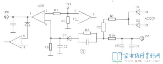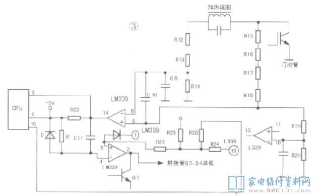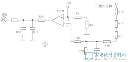 检锅电路由比较器LM339(8)、(9)、(14)脚及其外围元件组成。振荡波形通过电阻R12、R13与R14分压加入LM339(8)脚;另一端通过R15~R18与R10、R20分压加入LM