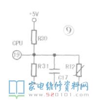 CPU(19)脚为锅底温度检测输入端,如图9所示。温度升高,RT2阻值下降,则(19)脚电座下降,当下降到设定值时,CPU将发出关槐指令。