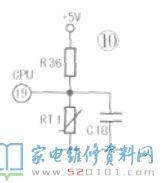 CPU(20)脚为门控管温度检测输入端,如图10所示。当门控管温度升高时,RTl阻值下降,则CPU(20)脚电压下降,当下降到设定值时,CPU将发出关机指令。