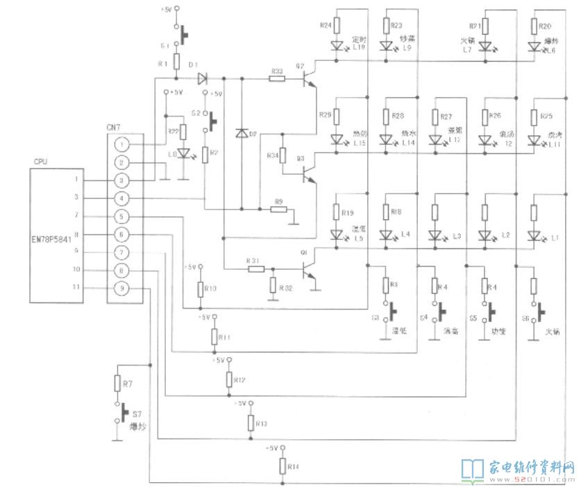 CPU(7)~(11)脚均为双向I/O口。分别送入“低温”、“高温”、“功能”、“火锅”、“烧烤”五种指令,并在待机状态下组成五级循环导通器,在内部振荡信号驱动下,轮流导通,循环点亮L1~L5。