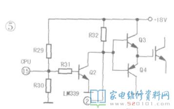 339(9)脚,经过比较器放大后从LM339⑩脚输出脉冲,送入CPU(5)脚,CPU对输入脉冲计数来判断有无锅,从而控制电磁炉工作。LM339(4)脚(反相输入端)接+5V电压,(5)脚同相端接收来自CPU(16)脚、LM339(13)脚、LM339(1)脚等控制信号电压。如果超过设定值,则比较放大器反转,将来自Q2集电极脉冲信号钳位为零,使推挽管Q3、Q4无输出,门控管停止工作。