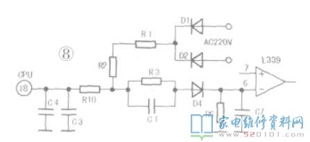 CPU(18)脚为交流电压检测输入端,如图8所示。220V交流电压经D1、D2整流,R1、R2、R10降压,C4、C3平滑滤波后送到CPU(18)脚。CPU根据监测电压的变化,自动发出相应动作指令,以避免在市电电压过高或过