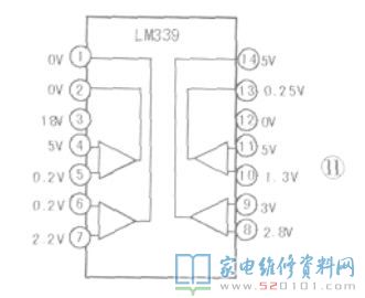 为便于维修时参考,特附上该机中单片机EM78P5841的引脚功能及待机电压,见表1。待机时,LM339各脚电压如图11所示。