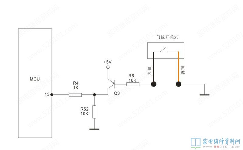 最后画一下电路图,应该是下图这样的,这下就很明白这个电路了:当门闭合时,带动S3触点闭合,Q3实际是一个PNP三极管,黑线和黄线通过R6,S3开关将Q3的基极拉低,Q3导通,将5v电压通过E-D送到MCU的13脚高电平,作为微波炉关门信号,这个13脚检测到这个电压,就认为门已经关好了。