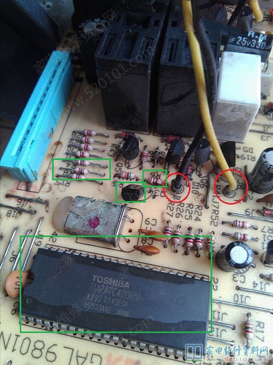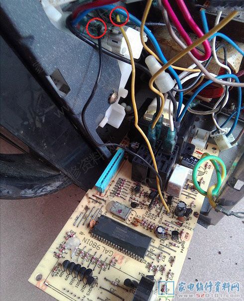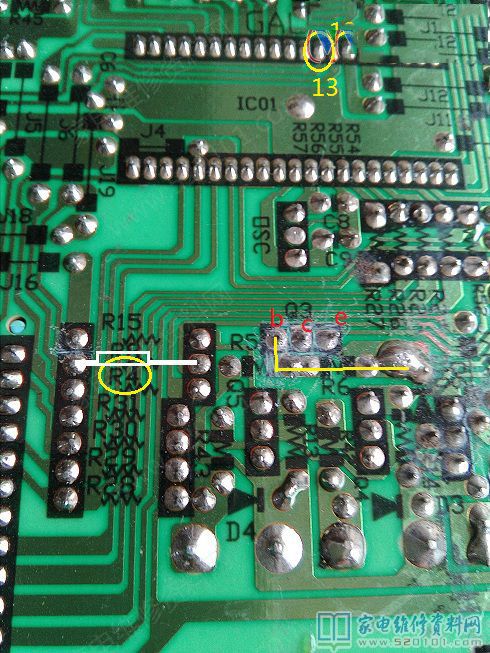 经过一番查找,发现这个黑线和黄线是接通电路板两个点,但为什么要接通这两个点呢?观察发现,黑线点通过一个R6接一个名叫Q3的三极管的基极,黄线点接地。而Q3的C极通过一个R52接地,另一端通过一个R4接到MCU的13脚,而E极接电源。
