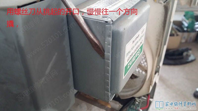先用锋利的凿子,把磁控管的屏蔽罩挑起一个角
