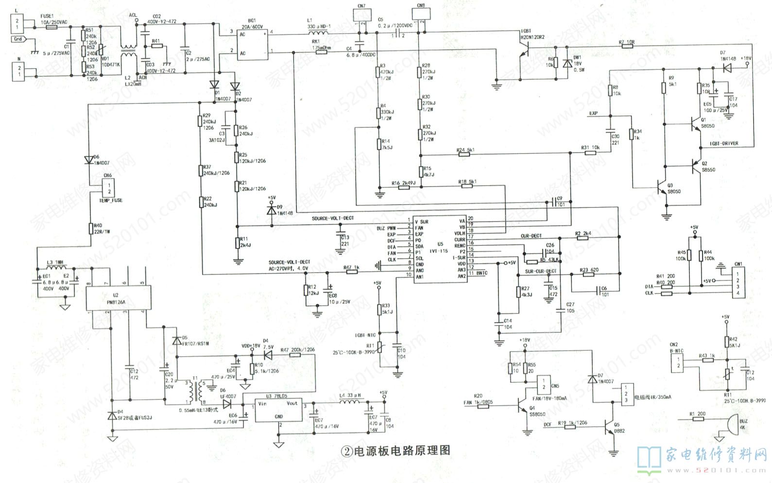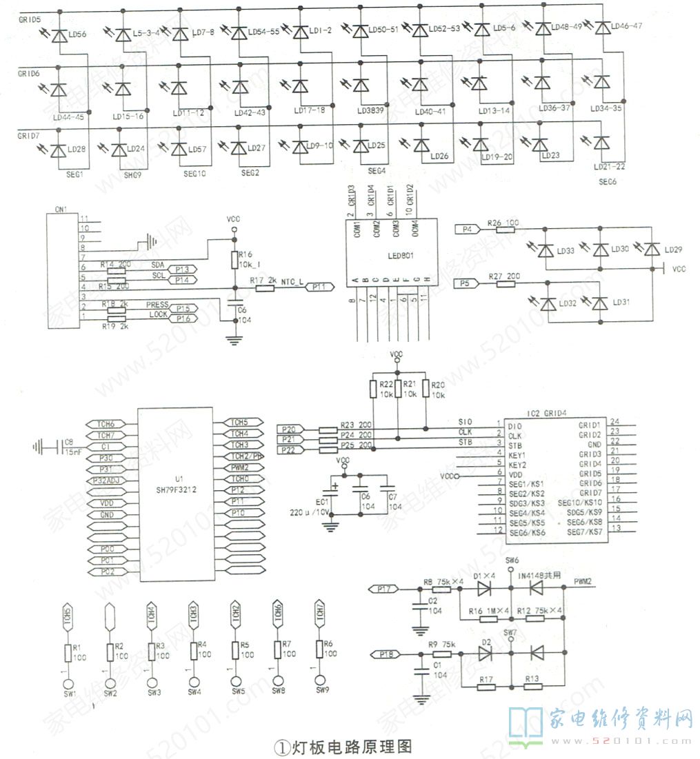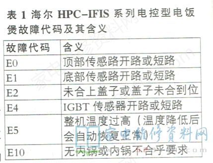 海尔HPC-IFIS系列电控型电饭煲采用线盘加热结构,其加热原理与电磁炉相同,均为电磁感应原理,即利用电流通过线圈产生磁场,当磁场内的磁力线通过锅底时,产生的小涡流让锅体自行快速发热,从而加热锅内食物。该系列电饭煲采用锅底和锅顶双温控方式,其热敏电阻在常温下的阻值均为100kΩ。开机后,单片机将启动内置程序并结合温控器实时传回的数据根据不同阶段发出相应的功率调节信号,以完成吸水(水温约为55C,时间约为6min)、 加热、沸腾保压( 15min 20min)、饭、保温(温度约为73°C)等功能。该系列电饭煲的具体型号有HPC-I-一FLS5066、HPCFLS5066A、HPC-I-FLS50Y2等,其灯板电路如图1所示,主板电路如图2所示,故障代码及其含义见表1。