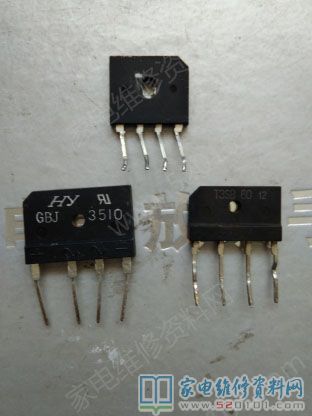 带着疑问,断开整流桥堆交流输入一个脚,通电控制面板指示灯亮了,又是什么情况?维修一时进入了误区,顺手拿起坏的整流桥堆又拿起一个电磁炉常用整流桥堆,这回明白了,犯了一个低级错误,原来是引脚正负极焊反了(下图小的是海尔电磁炉桥堆和常用电磁炉桥堆)。