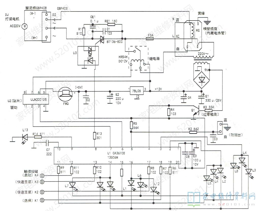 接修一台九阳DJ13B-DB68SG豆浆机,通电后不能正常打浆。该豆浆机款式新颖,采用触摸控制技术,按键电路与电脑控制电路安装在一块电路板上,实绘电路如图1所示。拆机直观检查,发现5A保险管(小体积)已经 发黑熔断。用万用表检测,双向可控硅BT136-800的三个电极均击穿,在路测其余阻容元件完好。双向可控硅BT136- 800参数为600V/4A,用手头的BCR8PM(700V/8A,塑封)代换。因找不到5A保险管,暂时用CRT彩电的3.15A延时保险管代替。在豆浆机桶中加适量水,通电试机。开始加热正常,当要转入打浆程序时,突然听到机内“嘭”的响了一声,立即断电检修。