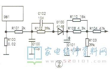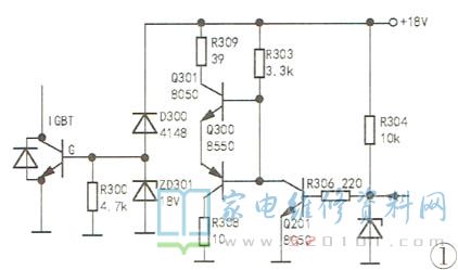 该机IGBT驱动电路如图1所示,三极管Q300、Q301为IGBT驱动管。经查,Q201未安装,则IGBT不受MCU控制,上电后IGBT因G极一-直为高电位,IGBT因失控而击穿。装上Q201后试机,电磁炉虽然加热正常,且各项功能调节也正常,但整机电流保持在5A左右,调不上去,即使屏幕显示功率为2100W ,但实际功率只有1100W左右,看来PWM电路还有问题。该机功率调整电路如图2所示。经查,电阻R103未安装。装上R103后试机,加热正常,故障排除。