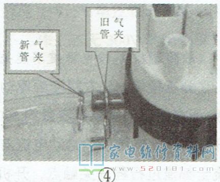 该故障的解决办法是更换气管或水位传感器,连接牢固水位传感器的连线。需要说明的是,该机从2015年10月起使用新式的双簧气管夹,如图4所示。该类气管夹比旧式的单簧气管夹密封性能更好,因此需把旧式的单簧气管夹更换为双簧气管。