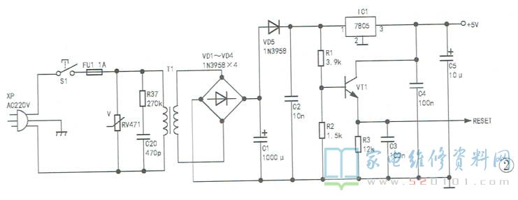见图1所示,220V交流市电由电源插头XP引入,经电源开关S1,保险管FU1后从电源变压器T1次级取出AC12V电压,由VD1~VD4桥式整流,再由ICI(7805)输出5V稳定电压,为CPU键控、显示及驱动电路供电。压敏电阻RV作错相、超压保护,R37、C20、C2、C4为高频消噪元件,C1、C5为低频滤波电容,VD5为隔离管(可不用)。