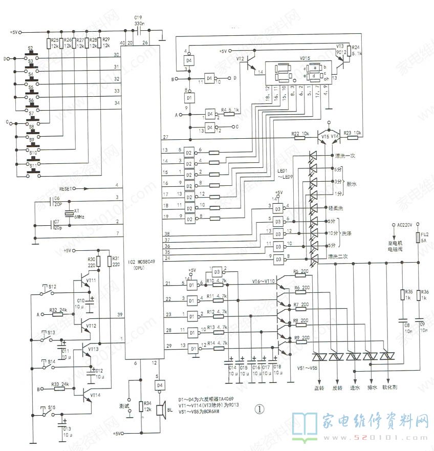 CPU 27脚输出的键扫描脉冲直接加在VT5基极,并经D1⑨、⑧脚反相后加在VT4基极,使得发光二极管LED1~LED4与LED5~LED9的正极分别引入极性相反的信号,CPU 24、35~38脚输出根据运行程序设定的信号电平,经D3五个反相器反相驱动后,使对应的发光二极管发光。如按S6选择“轻柔洗”时,LED5会亮等。