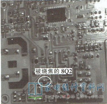 摘下电脑板(型号:BW-HK519)维修,重点检查电子点火电路,发现变压器8T1旁边的贴片三极管8Q2已烧焦,如图1所示,顺着线路查看,发现8Q2与8Q1组成对管,再与变压器构成振荡电路,8Q1的丝印为“Y1",由此判断8Q2应该是PNP型三极管S8550 ( 丝印为ZTY)。参考其他电子脉冲点火器电路,上述分析基本正确。更换8Q2后试机,故障排除。
